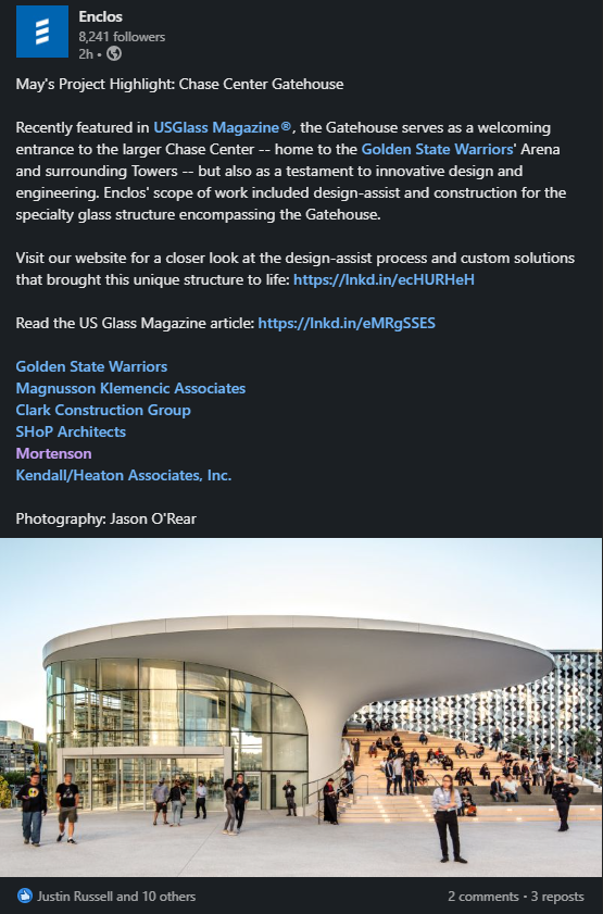 My current role is Preconstruction Proposal Coordinator & Social Media Manager at Enclos. I am responsible for composing and designing proposals for potential projects using the Adobe Creative Suite. I also manage the Enclos social media accounts.