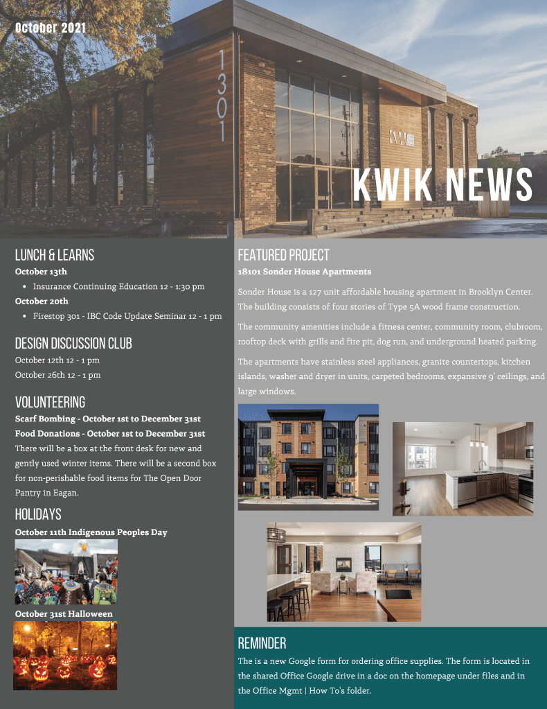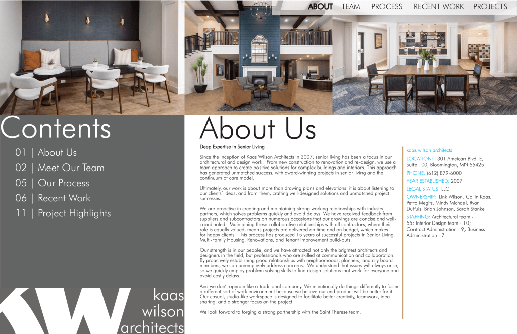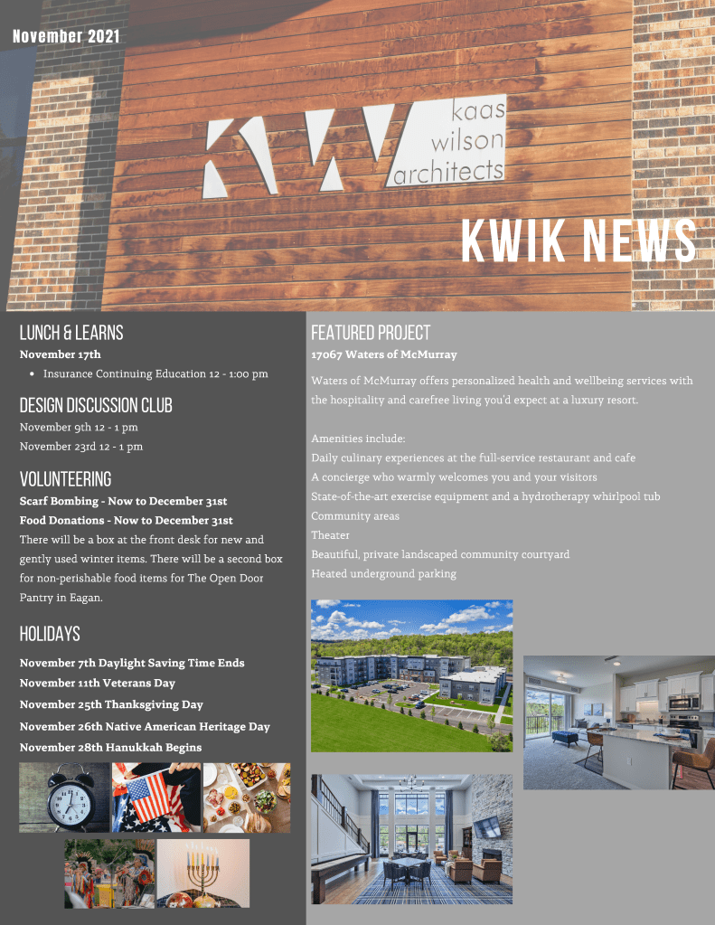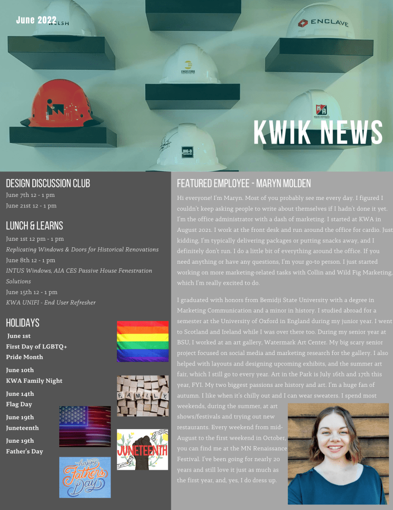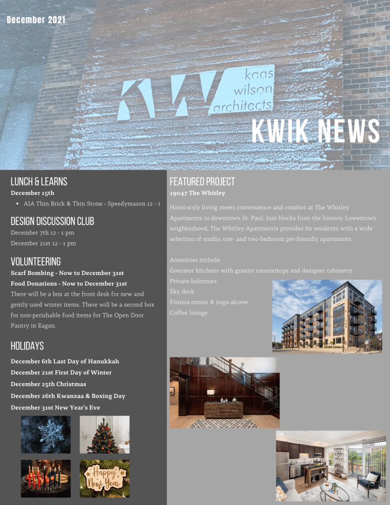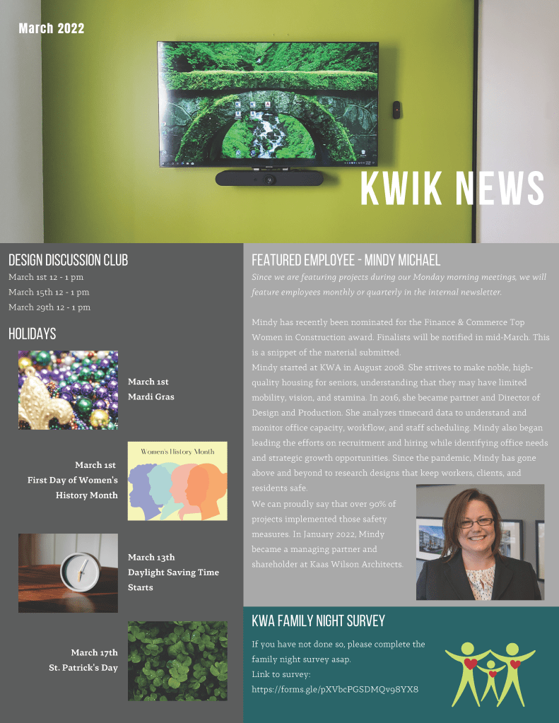 I designed monthly internal newsletters for Kaas Wilson Architects. Every month I met with employees, HR, and the BIM manager to coordinate pieces.