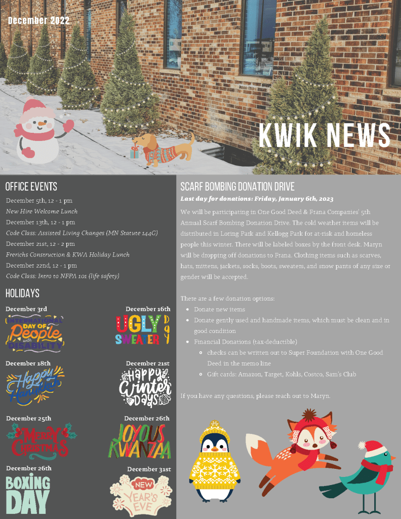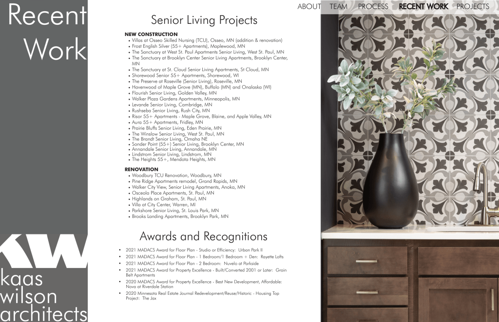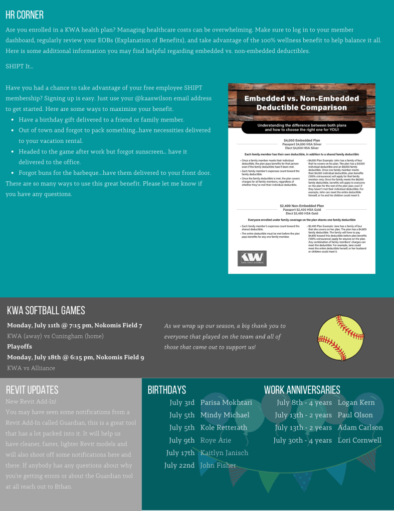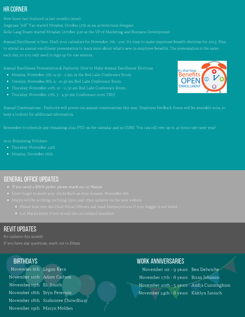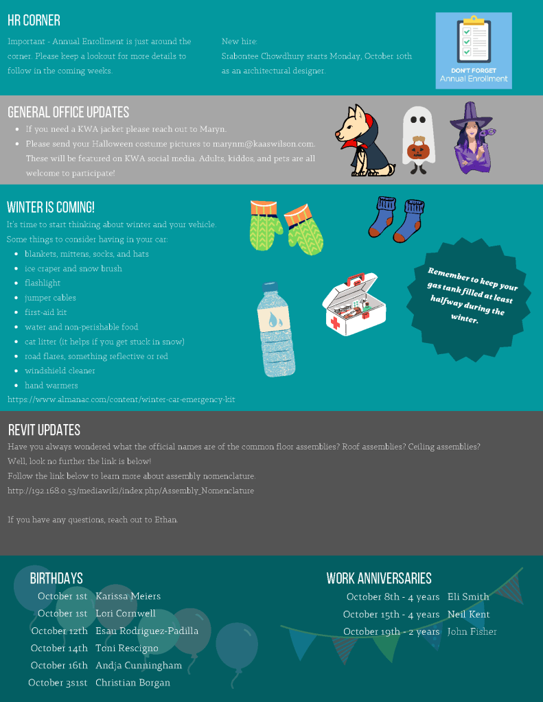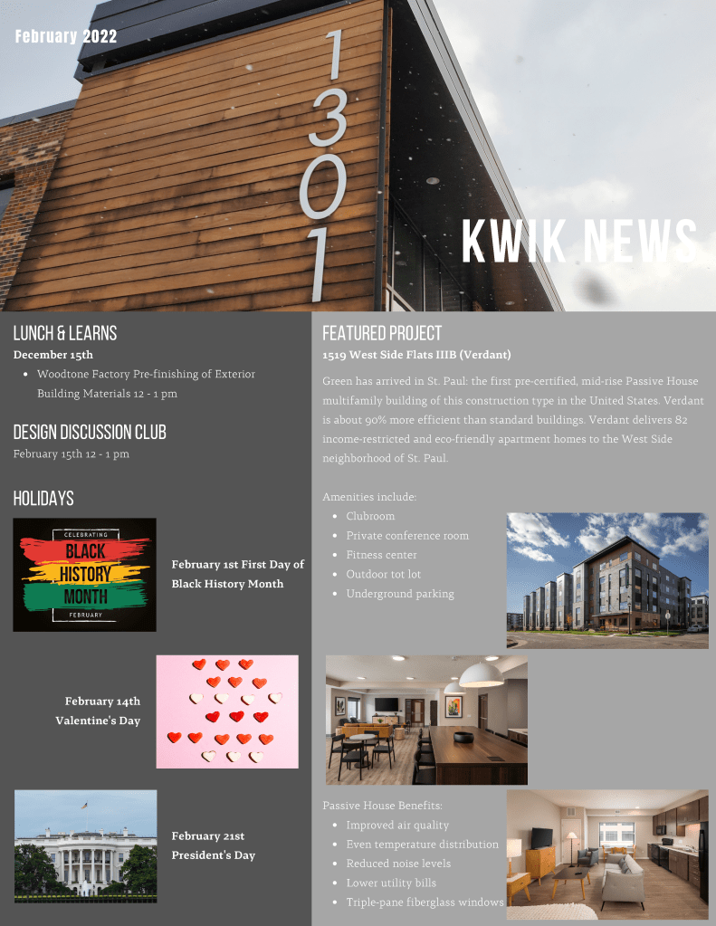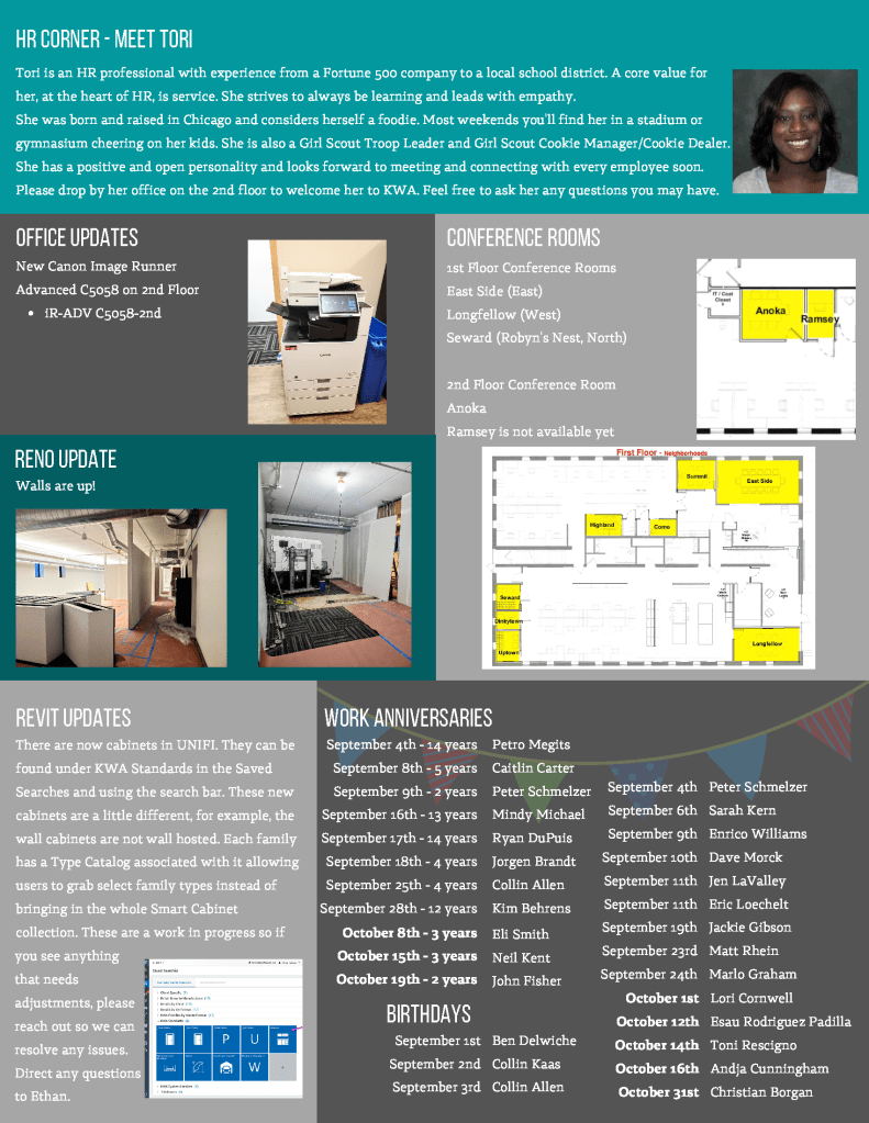 I designed monthly internal newsletters for Kaas Wilson Architects. Every month I met with employees, HR, and the BIM manager to coordinate pieces.